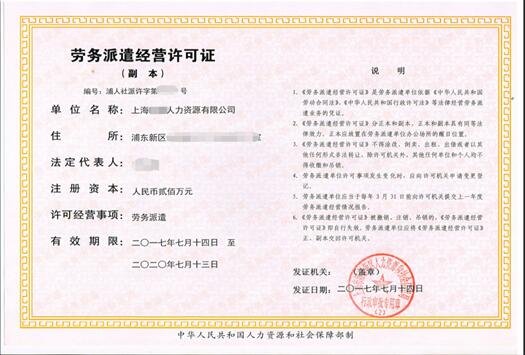 2.一個流程下來40天左右就可以拿到嶄新的《勞務(wù)派遣經(jīng)營許可證》正副本、營業(yè)執(zhí)照正副本、公司一套章、(公章、法人章、財務(wù)章),接下來就看各位老板各顯身手了。在這給大家展現(xiàn)一下最新的《勞務(wù)派遣經(jīng)營許可證》的模板參考一下,謝謝!